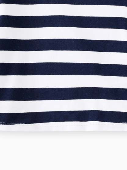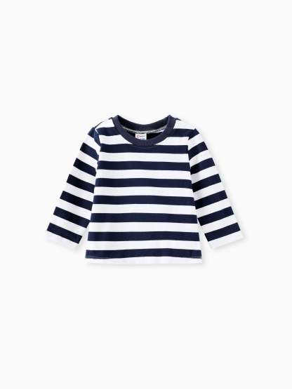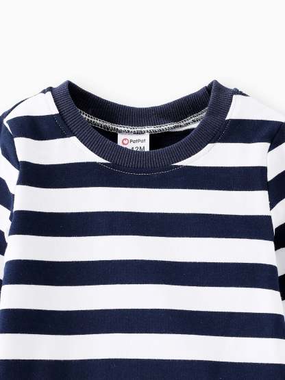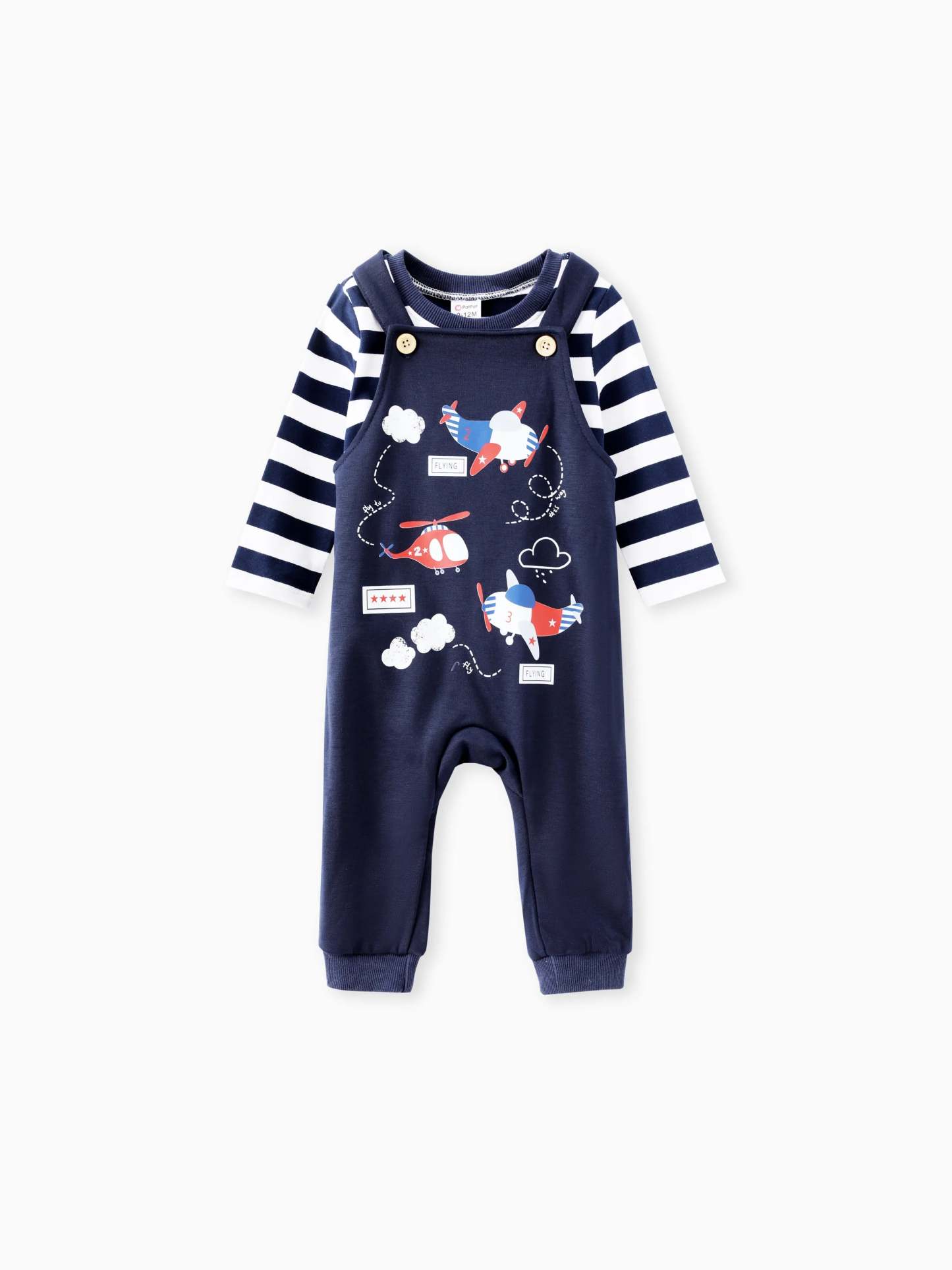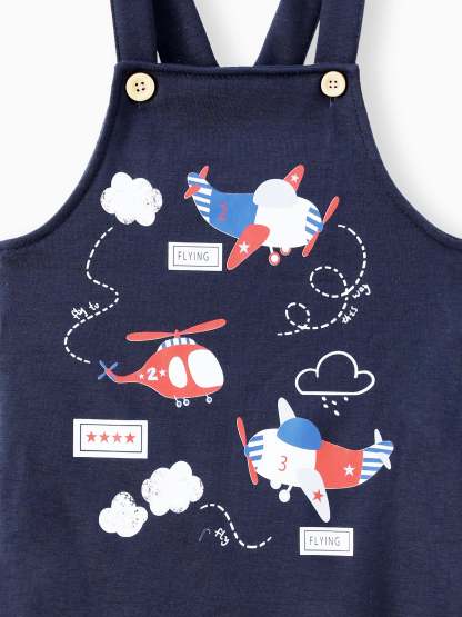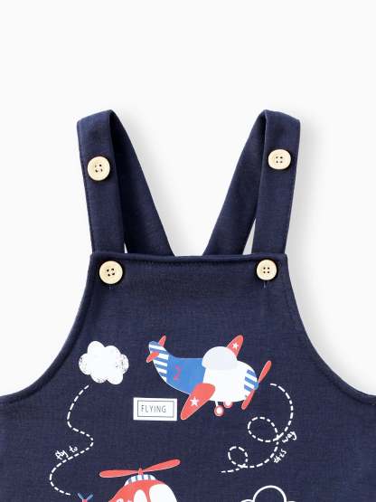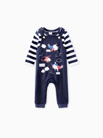 Niedliches gestreiftes Oberteil mit Flugzeugdruck und passender Latzhose, ideal für Aktivitäten im Freien während der Herbstsaison.