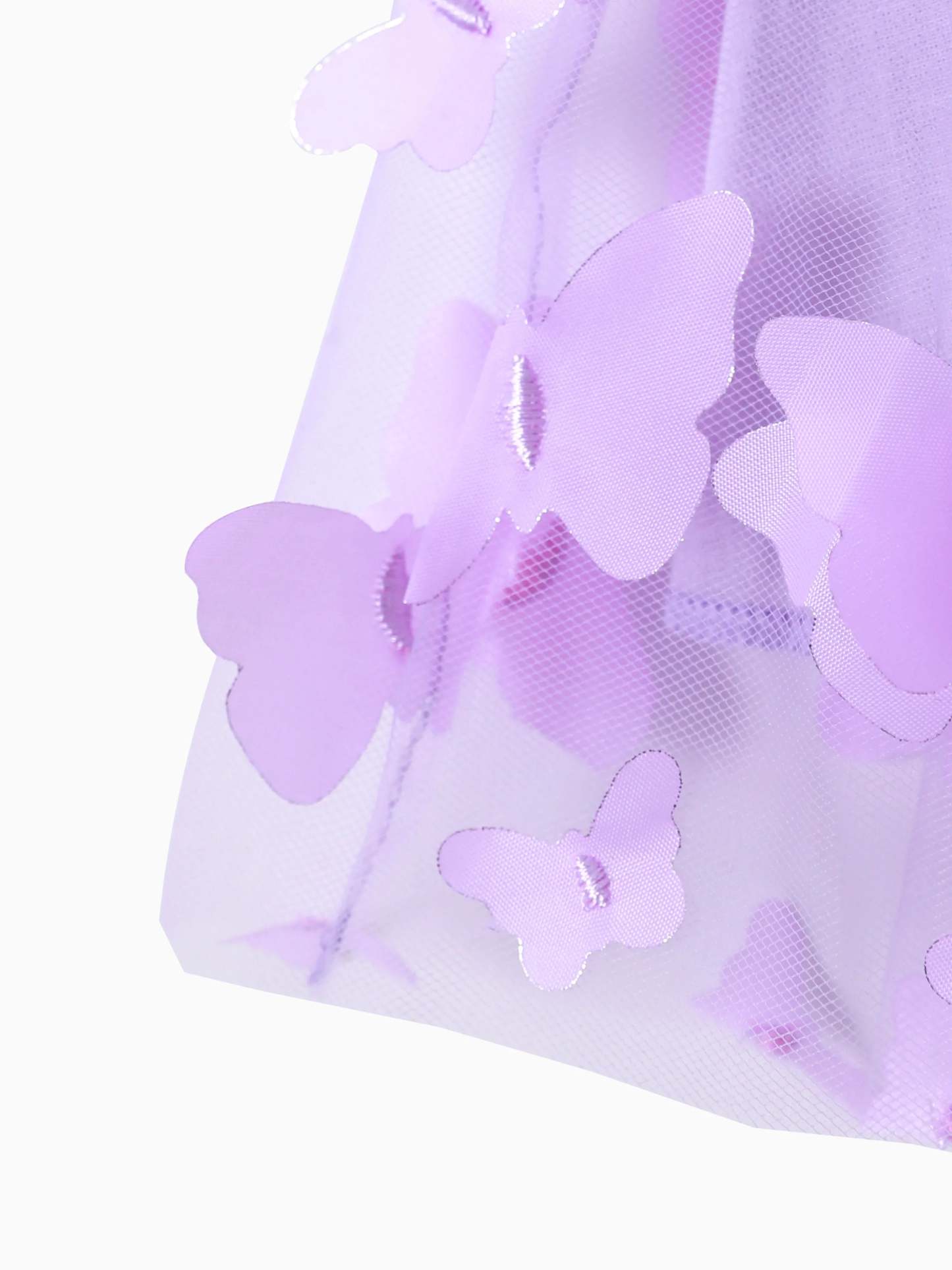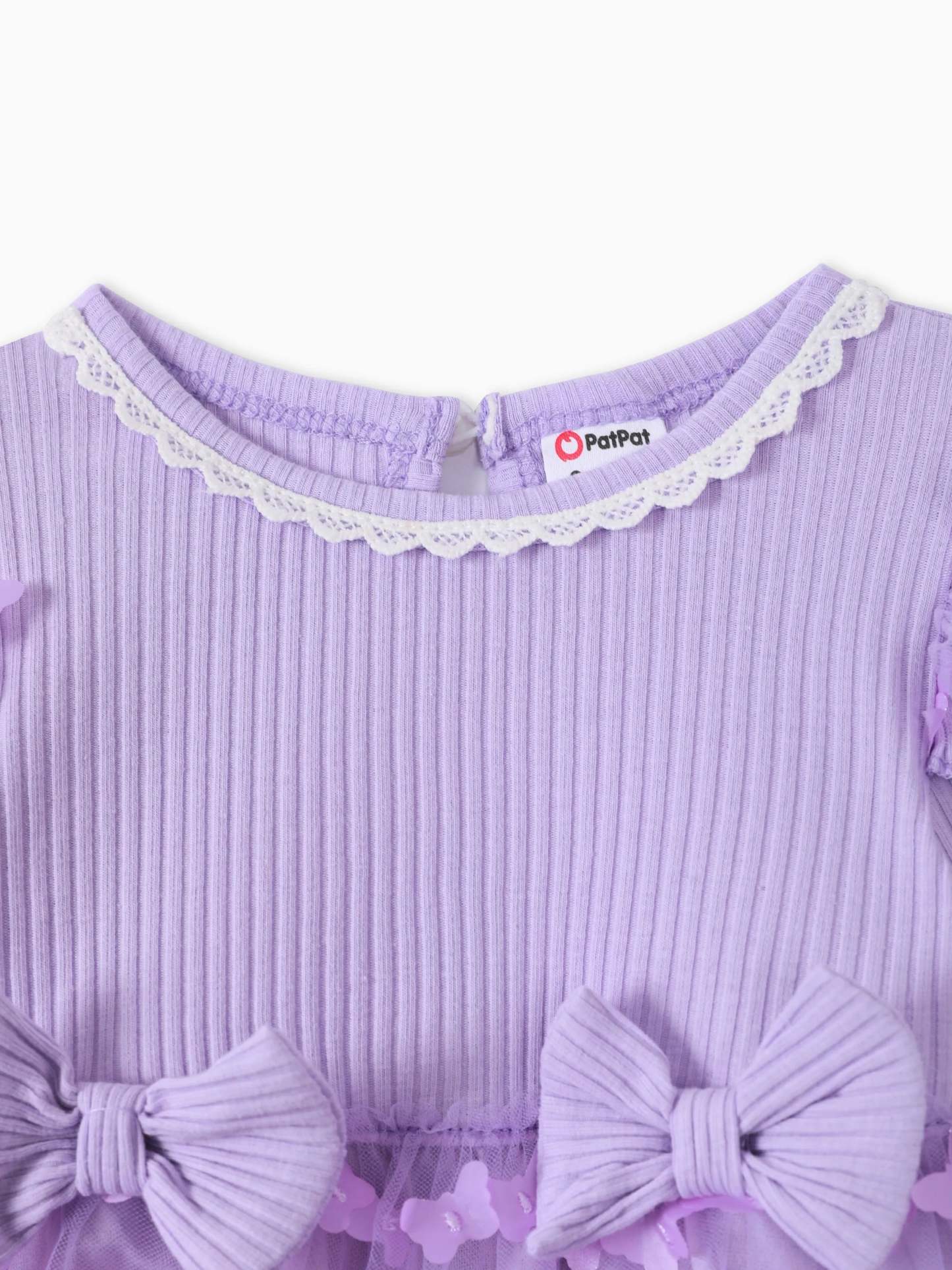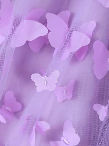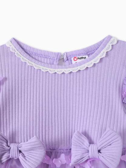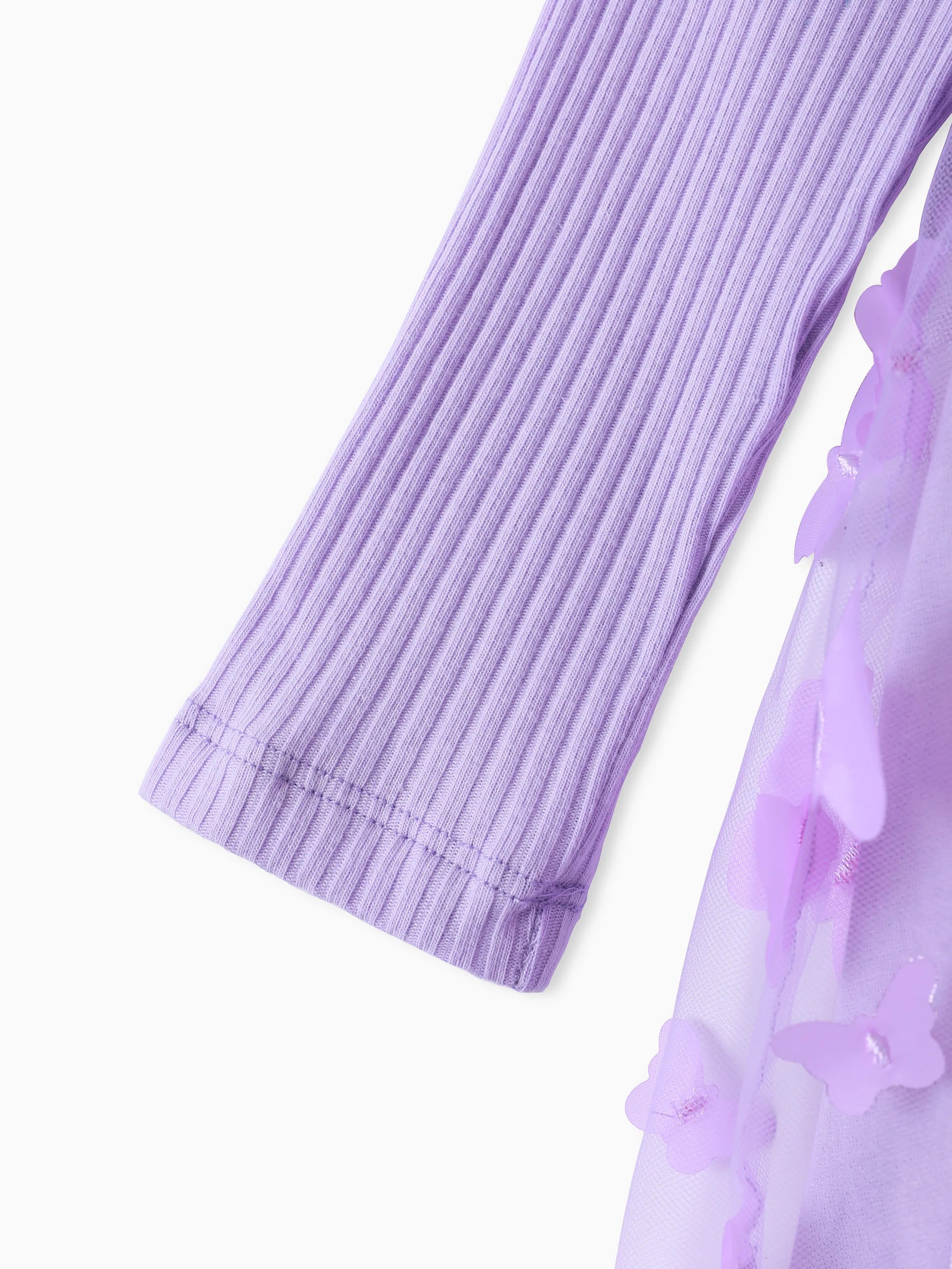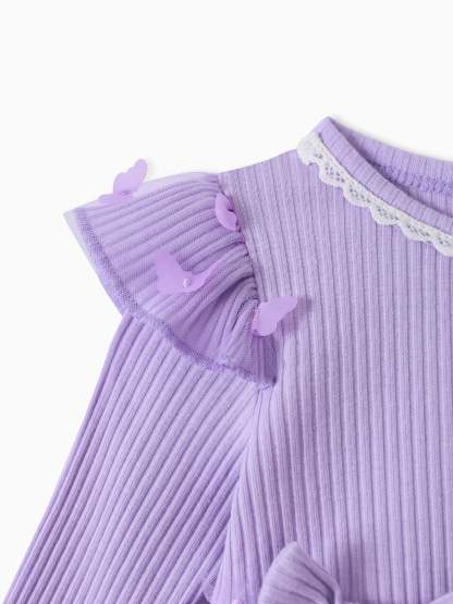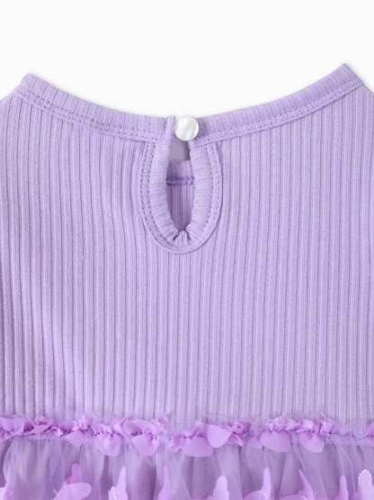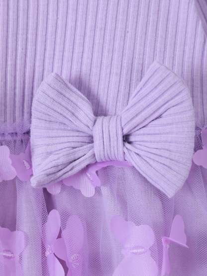 2pcs Baby Mädchen 95% Baumwolle gerippt Langarm Spleißen 3D-Schmetterling Applikationen Netzkleid mit Stirnband-Set lila