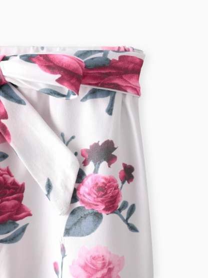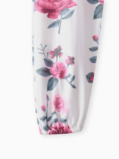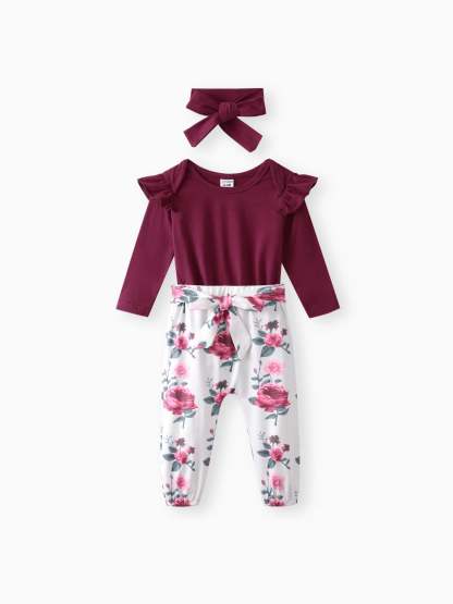 3-teiliges Baby-Mädchen-Rüschen-Langarm-Strampler aus 95 % Baumwolle und Blumendruck-Hose mit Stirnband-Set tief magenta