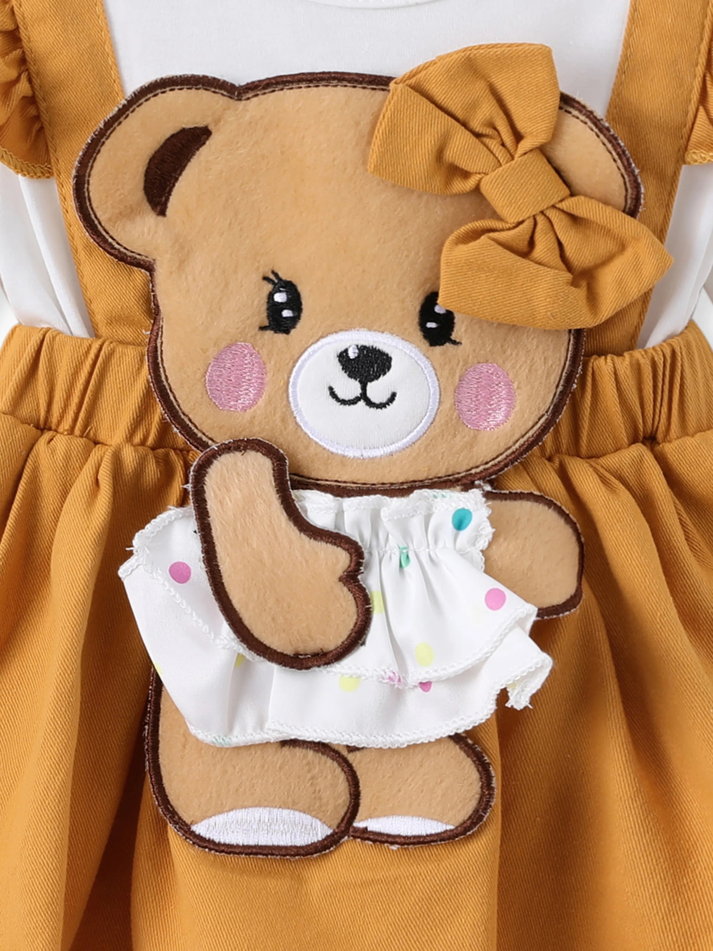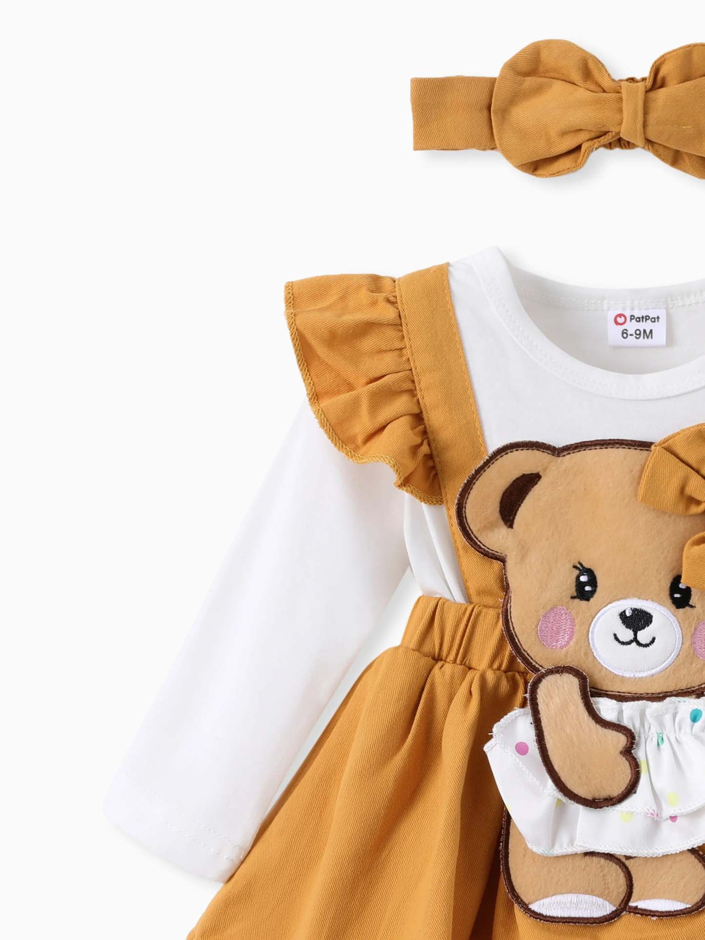 Präsentieren Sie Ihr niedliches Baby-Mädchen mit unserem hyper-taktilen 3D-Set aus 2 Bären-Grafik-Rüschen-Rompern. Es enthält ein bequemes, weiches und elastisches Baumwoll-Romper mit Rüschenbesatz, langen Ärmeln und einem Bärendesign sowie einem passenden Stirnband.