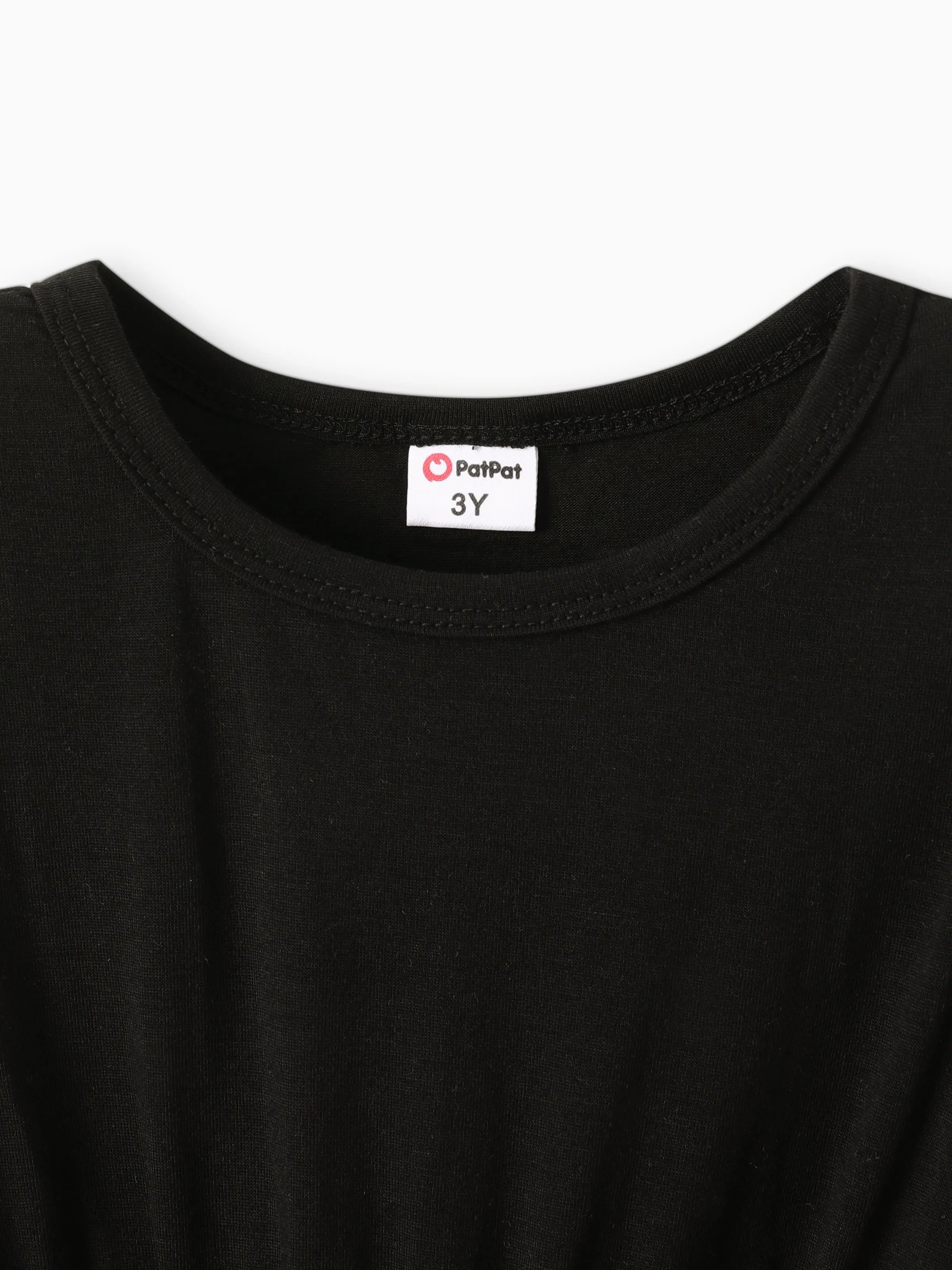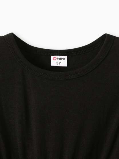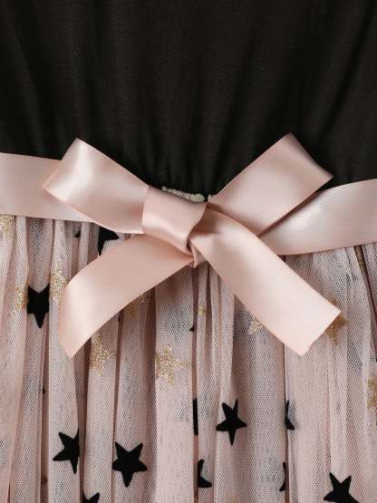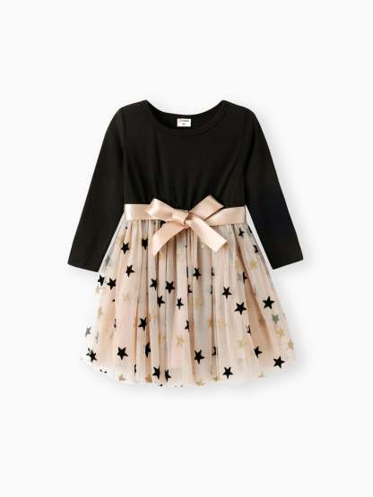 Toddler Girl Stars Glitter Design Mesh Splice Belted Long-sleeve Dress Black